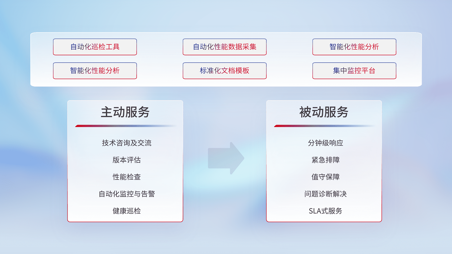 智能化工具和标准化文档,,保障服务质量,,,,提供主动服务(包含技术咨询、、版本评估、、、、性能检查、、、、自动化监控与告警、、、、健康巡检)和被动服务包含(分钟级响应、、、、紧急排障、、、、值守保障、、、、问题诊断解决、、、、SLA服务)。。。。