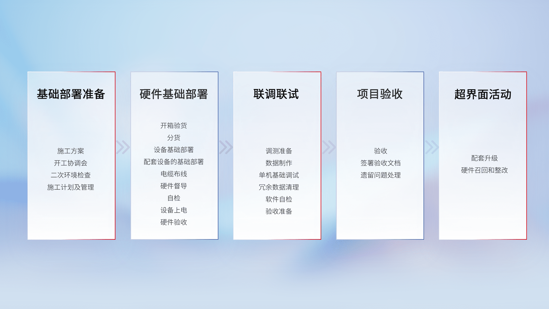 从基础部署准备、、、、硬件基础部署、、、、联调联试、、、、项目验收、、、越界面活动的全过程可追溯,,,,保证施工质量和进度。。